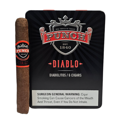 Punch Diablo Diabolito is the perfect quick smoke when you crave bold flavor. Packed with A.J. Fernandez’s rich blend of Nicaraguan and Honduran tobaccos under a jet-black Ecuadorian Sumatra Oscuro wrapper, this tin cigar delivers a full-bodied mix of sweet earthiness, dark spice, and deep, satisfying flavor.